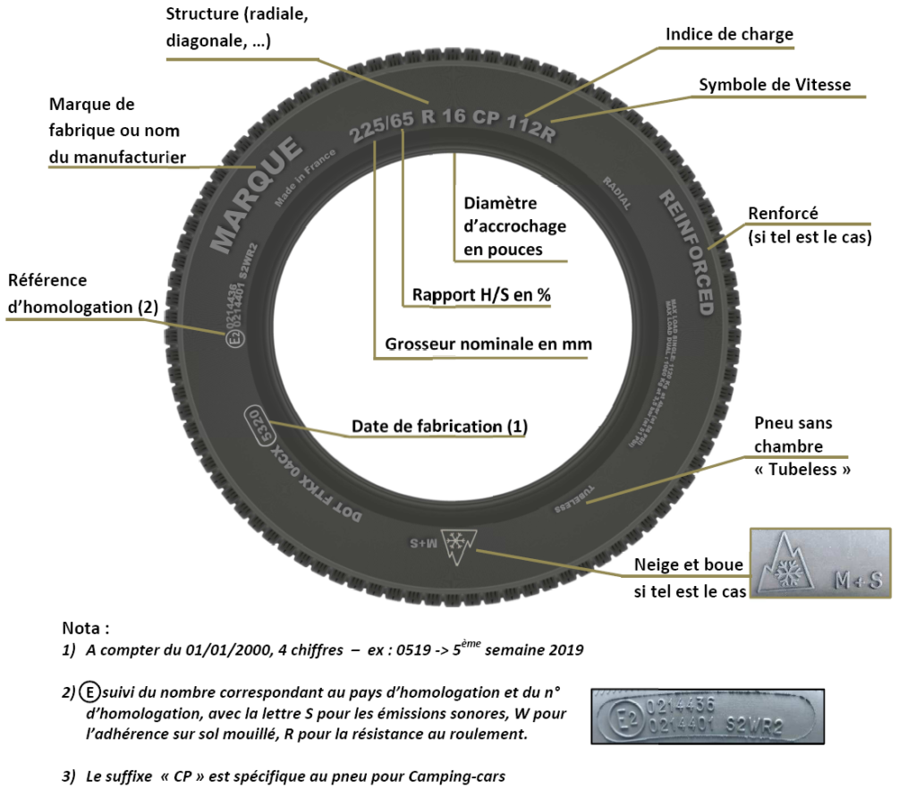 Exemple : La taille de pneu est 225/60 R17 indices 99 H. 225 : Largeur de la semelle du pneu, soit la partie du pneu en contact avec le sol. 60 : Ratio entre la hauteur du pneu et la semelle. R : Radial. Ce terme désigne la méthode de fabrication du pneu. 17 : Diamètre intérieur de la roue (aussi de vos jantes et enjoliveurs).