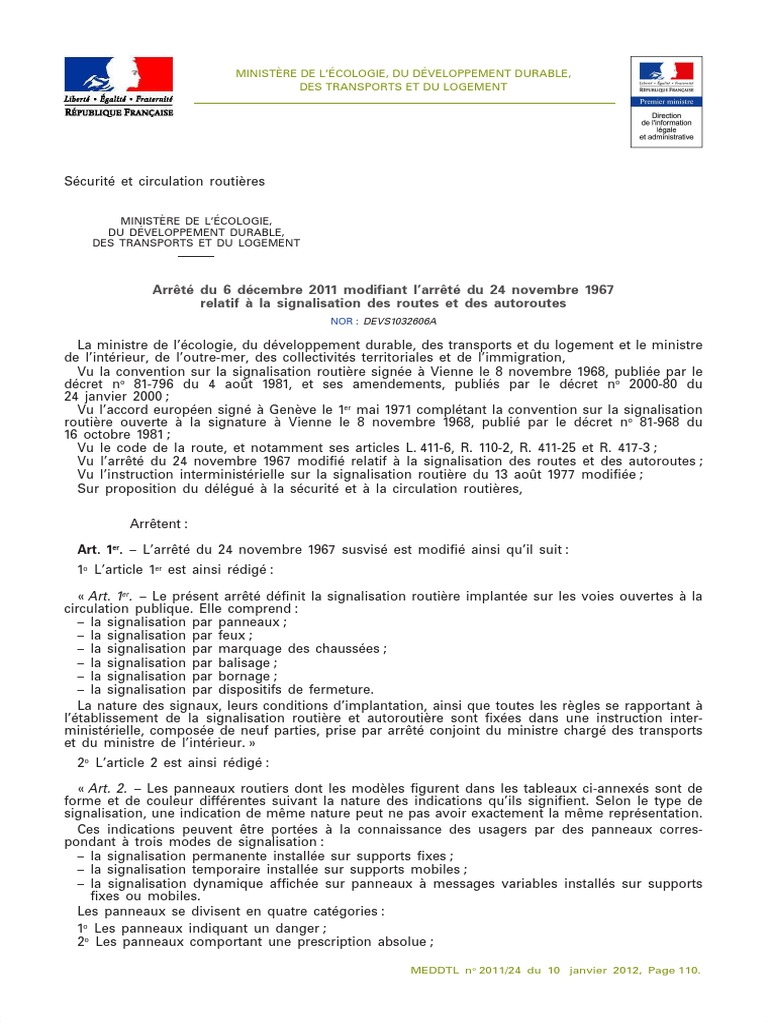 Arrêté Du 6 Décembre 2011 Modifiant L Arrêté Du 24 Novembre 1967 Relatif À La Signalisation Des