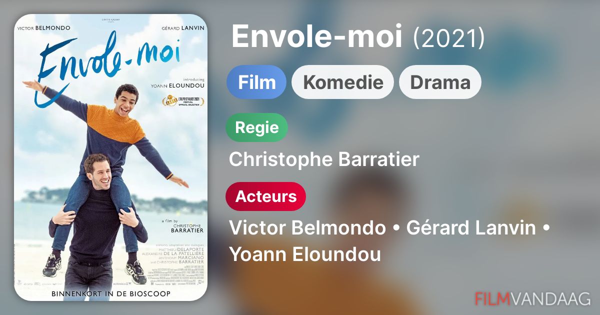 Envole-moi est un film (1h 31min) de Christophe Barratier (19 mai 2021) avec Victor Belmondo, Gérard Lanvin, Yoann Eloundou Noah. Découvrez 1 Bandes-annonces, l'actu et le casting de 13 stars sur CinéSérie.. Festival de Cannes Les César Les Oscars du cinéma Plus de festivals.
