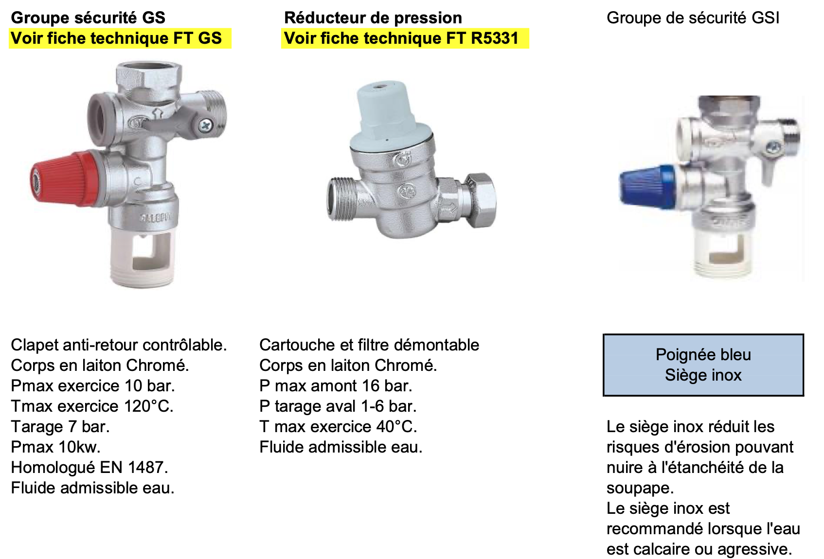 Le groupe de sécurité a 4 rôles essentiels : Il remplit le même rôle qu'une soupape sur une cocotte minute : lorsque la température de l'eau augmente, l'eau se dilate et fait augmenter la pression à l'intérieur du chauffe-eau. Pour éviter l'explosion du ballon, la pression doit être maintenue à une pression inférieure à 7.