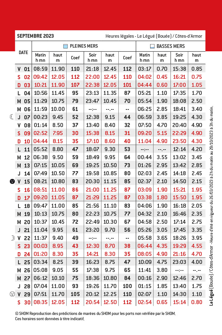 Horaires des marées Septembre Port d'Erquy Guide du port