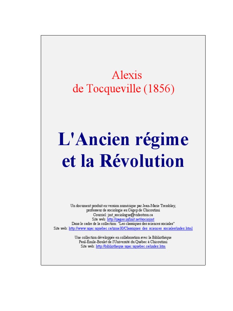 Collection « Les auteur (e)s classiques ». Alexis de Tocqueville, 1805-1859. L'Ancien régime et la Révolution (1856) Voir la table des matières du livre. Le livre en format Word 2008 à télécharger (Un fichier de 204 pages de 770 K.) Le livre en format PDF-texte (Adobe Acrobat Reader) à télécharger (Un fichier de 204 pages de 1,6 Mo.