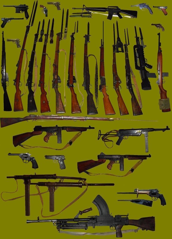 Assortiment d'armes à feu légères. Une arme à feu est une arme visant originellement à toucher une cible via des projectiles à haute vélocité, au moyen de gaz produits par une déflagration, combustion rapide et confinée d'un composé chimique détonant.. Depuis quelques siècles, à partir de la Renaissance tardive, les armes à feu sont devenues les armes prépondérantes de l.