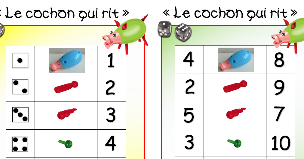 Le cochon qui rit, la règle du jeu expliquée. Dans le cochon qui rit, les règles sont simplissimes. Les dés affichant 6 donnent le droit au joueur d'obtenir le corps du cochon, 1 as lui permet de placer les « attributs » c'est-à-dire les pattes, oreilles ou encore yeux cependant pour mettre la queue en tir-bouchon, le joueur devra.