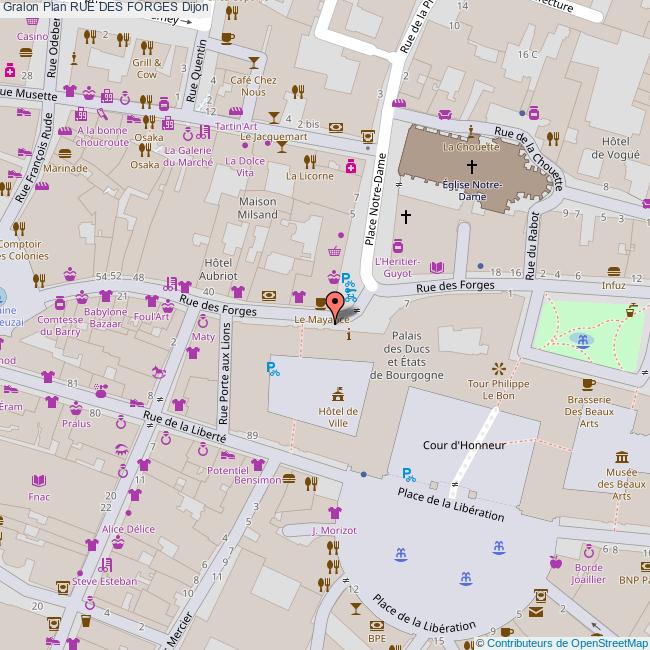 Rue des Forges, 21000 Dijon Driving directions The Green Guide . details activities accommodation restaurants Useful information. Description. This is one of the city's oldest and most characteristic streets. At no. 52-56, Hôtel Morel-Sauvegrain, which once belonged to Charles the Bold's wet nurse, has a 15C façade.
