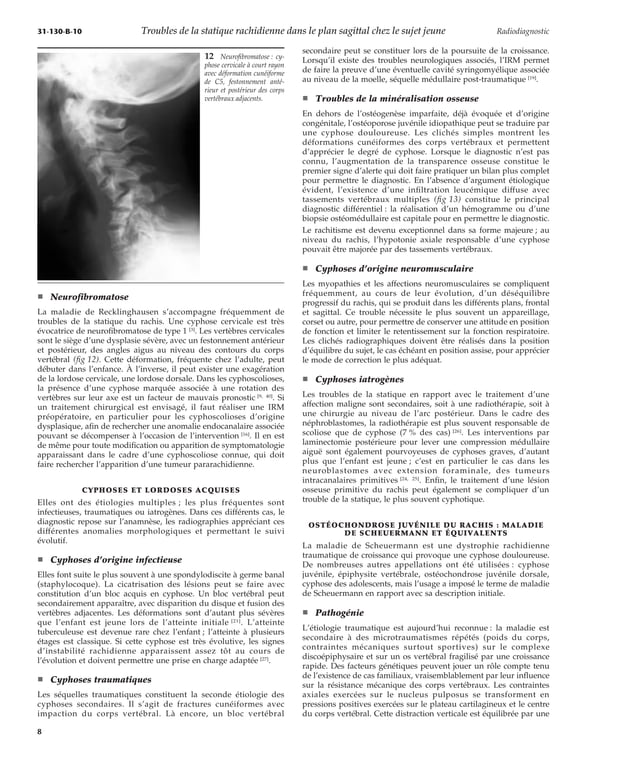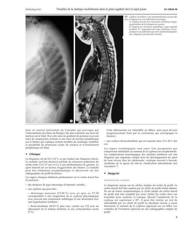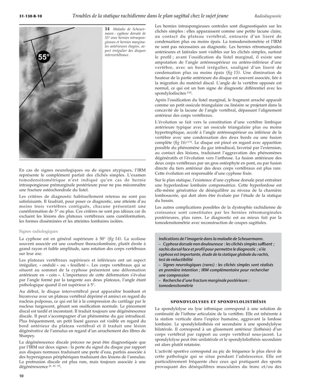 douleurs localisées à l'apex de la cypho-se dorsale ou en regard de la charnière thoraco-lombaire sont souvent le prélu-de d'une maladie de Scheuermann. L'association de douleurs à une défor-mation scoliotique doit faire rechercher une étiologie [5]. Douleurs rachidiennes et troubles statiques : le bilan clinique A. REDON, B. BIOT.