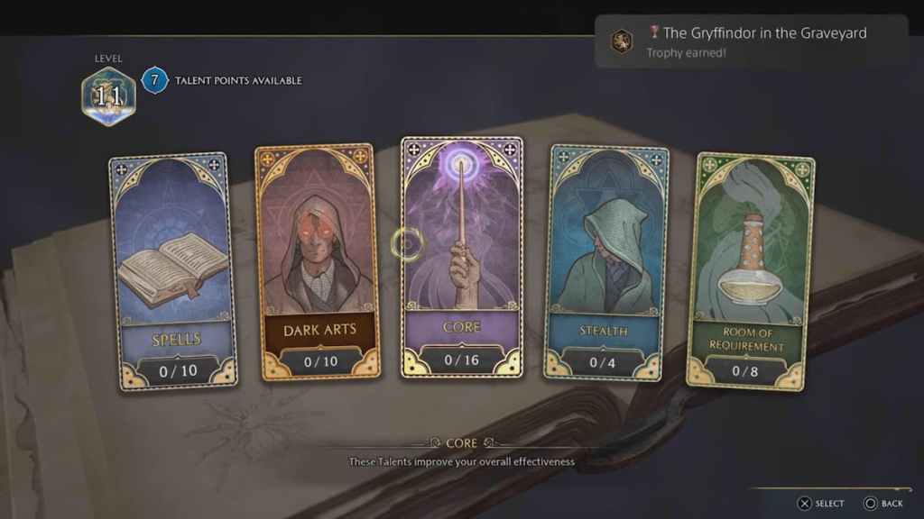 Un Gryffondor dans le cimetière Trouver la salle de la carte avec un Gryffondor; Auror en devenir Trouver la salle de la carte avec un Poufsouffle; Hibou sagace Trouver la salle de la carte avec un Serdaigle; L'étoffe d'un héros Trouver la salle de la carte avec un Serpentard; Un talent dispendieux Dépenser 5 points de.